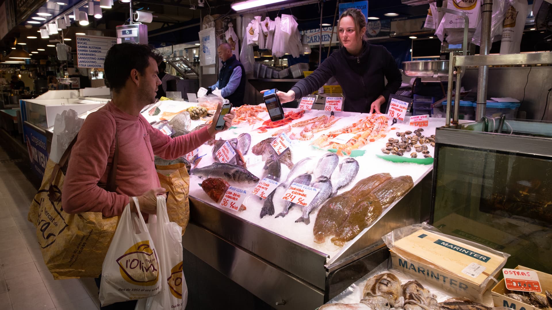 En kunde på et fødevaremarked i Palma, Mallorca, Spanien.