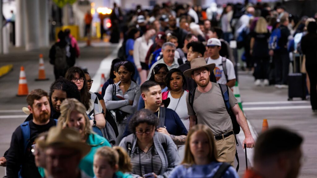 Rejsende venter i kø ved et checkpoint fra Transportation Security Administration (TSA) i William P. Hobby Lufthavn i Houston, Texas, USA, mandag den 9. marts 2026.